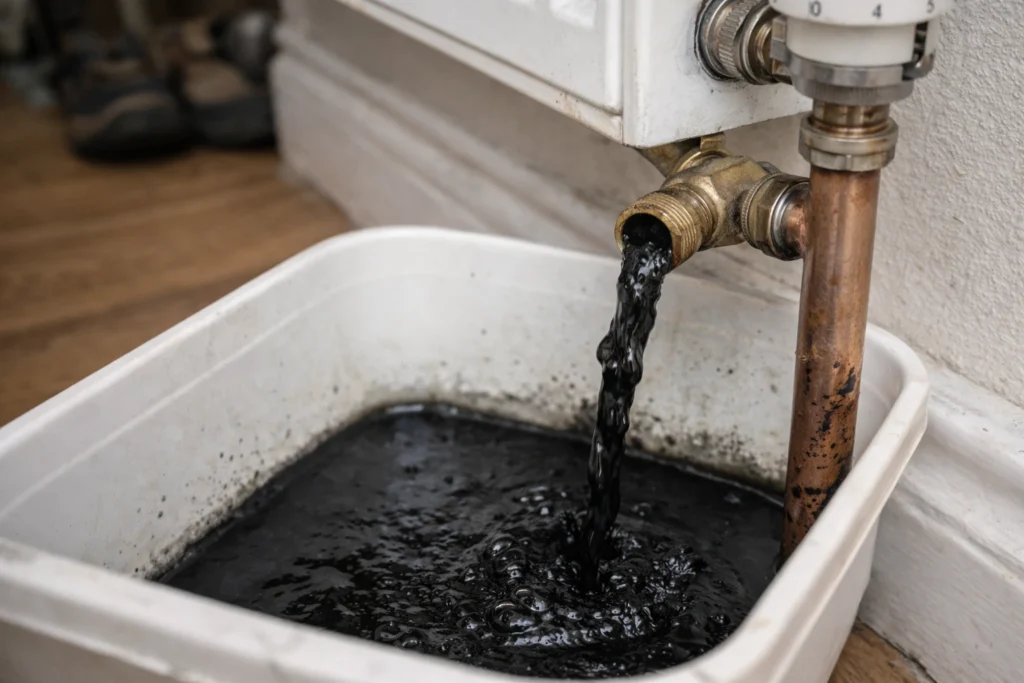 We’ve drained systems in Dublin homes where the water coming out was almost black. When that sludge collects at the base, it blocks hot water from circulating properly. The result? A radiator cold at bottom and warm only near the top.